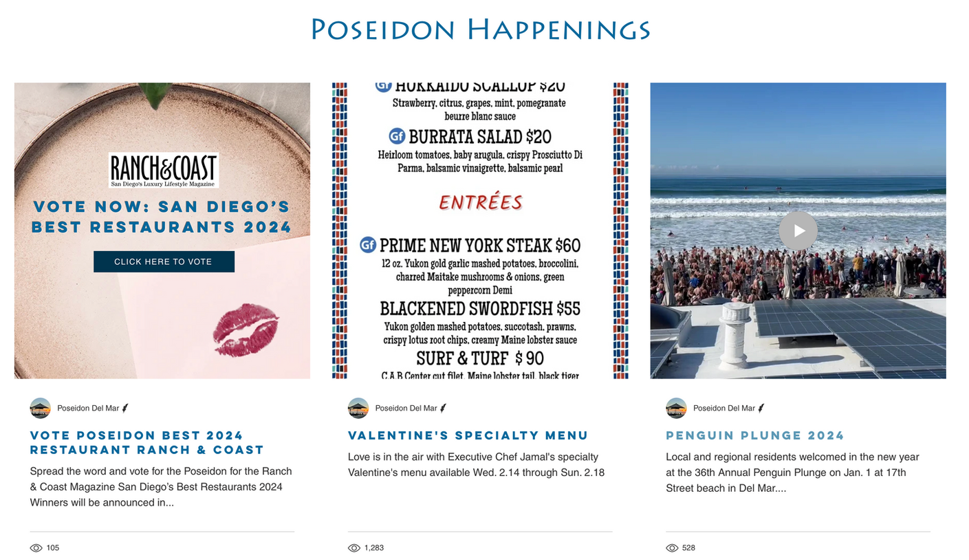 Our longtime client, Poseidon Del Mar's project involved creating a responsive website for a beach front restaurant in Del Mar, CA. We used our technical expertise to ensure that the website was linked to their reservation system, gift certificates, and menu pages. Our team took great care to ensure that the website was fully optimized for search engines and mobile devices, thereby ensuring maximum visibility and accessibility for potential customers. The website showcases Poseidon's 's beautiful menu items, the property and their amazing view and location.